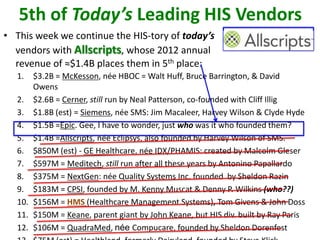 This document provides a history of Allscripts and its roots originating from Lockheed Aircraft Corporation's Medical Information System (MIS) in the 1960s. Key points: