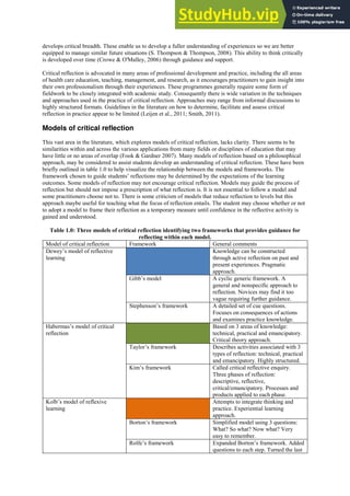 This document discusses critical reflection in the context of cooperative education programs. It begins by noting that while critical reflection is seen as important for learning, there is a lack of consensus around its definition and how to facilitate it. The document then explores some common models of critical reflection and frameworks that have been used to guide the reflective process. It acknowledges that critical reflection is difficult to define and apply in practice. The document concludes by emphasizing the importance of critical reflection for cooperative education programs and the need for structured support and feedback to help students develop reflective skills.