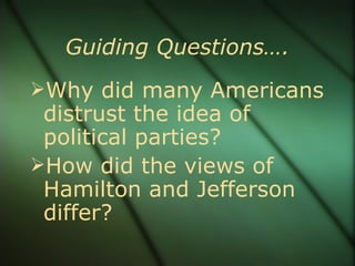 1. Early Americans distrusted political parties due to factions prioritizing personal gain over public good in Britain. However, Alexander Hamilton and Thomas Jefferson differed significantly on key issues like federal power and economic policy.