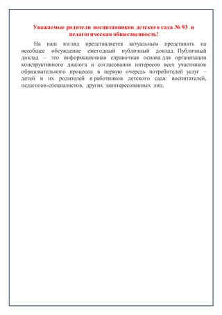 Доклад предназначен для обсуждения статусных и образовательных характеристик детского сада №93 в Таганроге, включая его организацию и цели. В учреждении представлена программа раннего детского образования, направленная на всестороннее развитие воспитанников с акцентом на индивидуальный подход. Также описываются различные кружки и услуги, а также внутренние процессы коррекции и развития речи у детей.