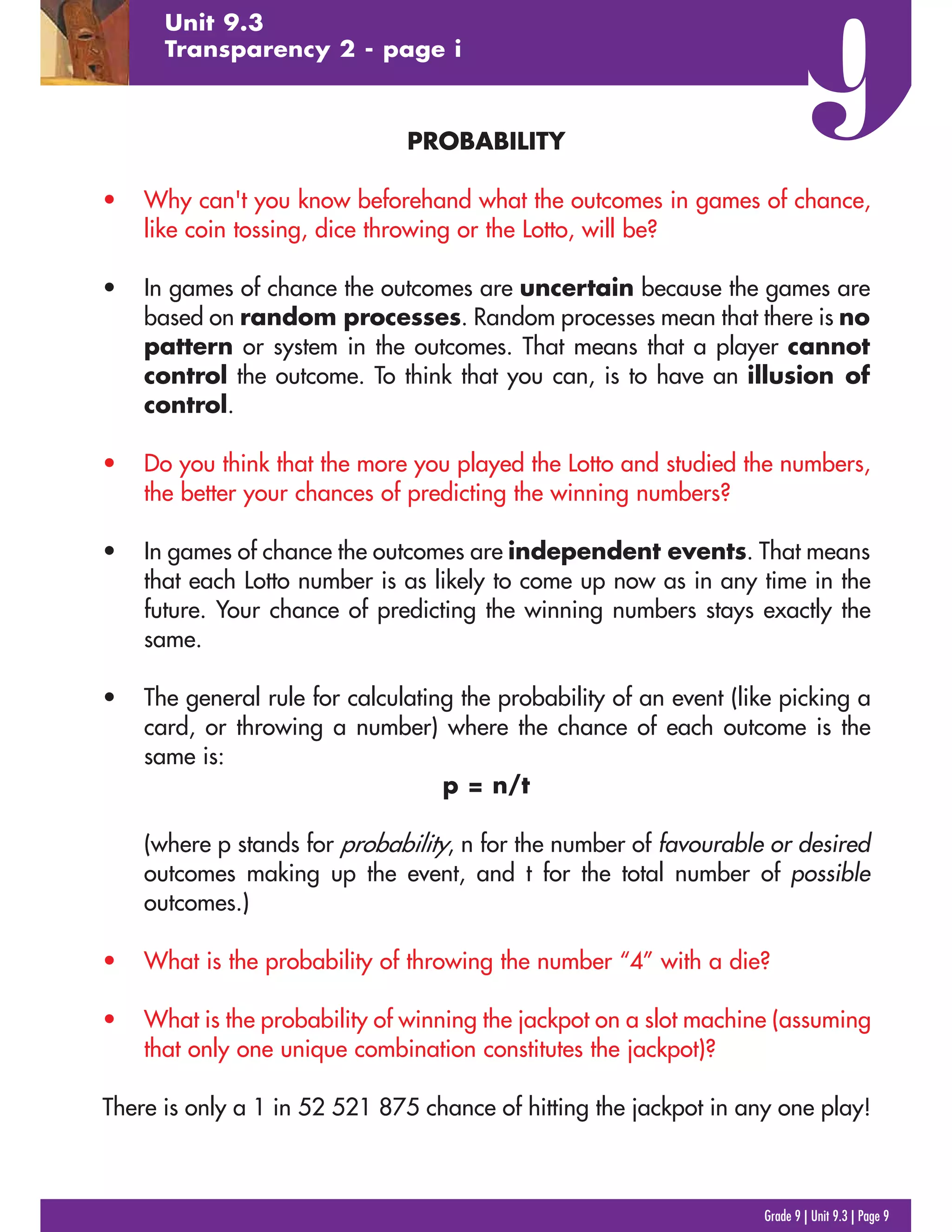 This document discusses probability and games of chance like coin tosses, dice rolls, and lotteries. It explains that in these games, outcomes are random and unpredictable because they involve chance without patterns. The probabilities of outcomes do not change over time. For example, the chance of picking a specific lottery number now is the same as in the future. When calculating probability, it is the number of desired outcomes divided by the total possible outcomes. In roulette, the probability of landing on an odd number is 18/37 since there are 18 odd numbers out of 37 total numbers on the wheel. Understanding probabilities can help people make sensible decisions about gambling by recognizing the risks involved.