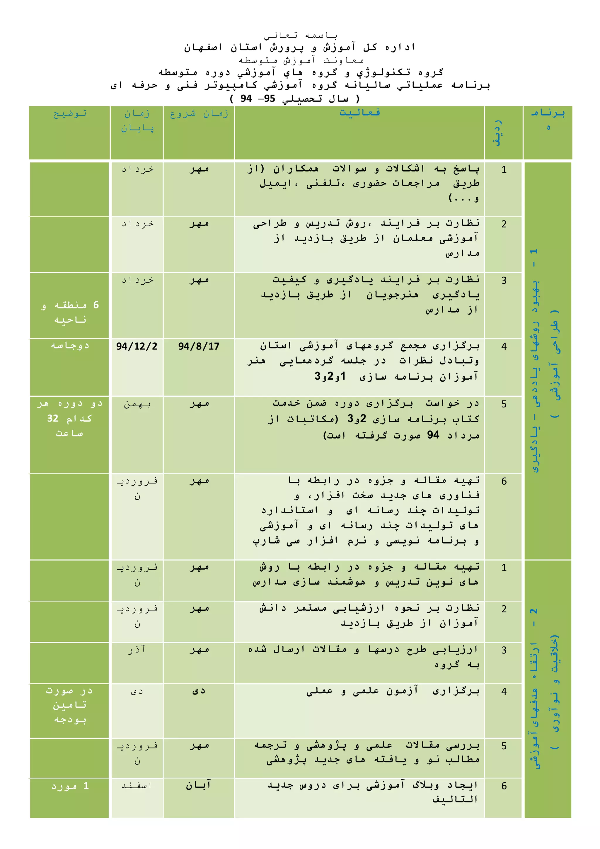 پرورش و آموزش کل اداره متوسطه آموزش معاونت متوسطه دوره آموزشي هاي گروه و تكنولوژي گروه آموزشي گروه ساليانه عملياتي برنامهای حرفه و فنی کامپيوتر سال (تحصيلي95–94) برنام ه رديف فعاليتشروع زمانزمان پایان توضیح 1-ياددهیروشهایبهبود–يادگيری )آموزشیطراحی( 1اشکاالت به پاسخسواالت وهمکاران(از ،ايميل ،تلفنی حضوری مراجعات طريق )...و مهرخرداد 2فرايند بر نظارت،طراحی و تدريس روش از بازديد طريق از معلمان آموزشی مدارس مهرخرداد 3فرايند بر نظارتکيفيت و يادگيری بازديد طريق از هنرجويان يادگيری مدارس از مهرخرداد 6و منطقه ناحيه 4استان آموزشی گروههای مجمع برگزاری هنر گردهمايی جلسه در نظرات وتبادل سازی برنامه آموزان1و2و3 17/8/942/12/94دوجاسه 5خدمت ضمن دوره برگزاری خواست در کتابسازی برنامه2و3از (مکاتبات مرداد94)است گرفته صورت مهربهمنهر دوره دو کدام32 ساعت 6با رابطه در جزوه و مقاله تهيه و ،افزار سخت جديد های فناوری استاندارد و ای رسانه چند توليدات و ای رسانه چند توليدات هایآموزشی شارپ سی افزار نرم و نويسی برنامه و مهرفروردی ن 2-هدفهایارتقاءآموزشی )نوآوریو(خالقيت 1روش با رابطه در جزوه و مقاله تهيه مدارس سازی هوشمند و تدريس نوين های مهرفروردی ن 2دانش مستمر ارزشيابی نحوه بر نظارت بازديد طريق از آموزان مهرفروردی ن 3مقاالت و درسها طرح ارزيابیشده ارسال گروه به مهرآذر 4عملی و علمی آزمون برگزاریدیدیصورت در تامين بودجه 5ترجمه و پژوهشی و علمی مقاالت بررسی پژوهشی جديد های يافته و نو مطالب مهرفروردی ن 6جديد دروس برای آموزشی وبالگ ايجاد التاليف آباناسفند1مورد