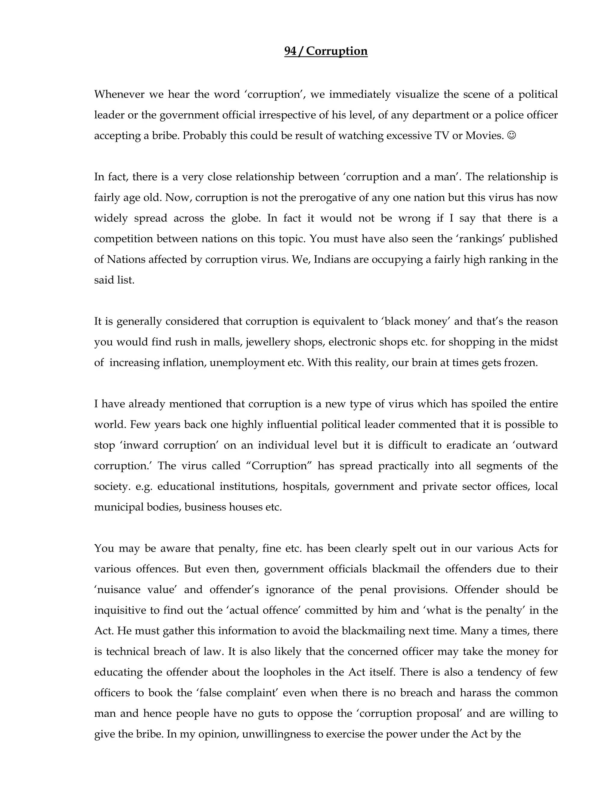 This document discusses the pervasive issue of corruption around the world and within India specifically. It notes that corruption has spread to almost all segments of society, including government, education, healthcare, and business. The document explores how corruption occurs at many levels, from seeking employment to promotions, and how once someone engages in corruption it is difficult to stop as there is pressure to share bribes up the chain. It also discusses how corruption has negatively impacted society and how individuals can choose to maintain integrity even when faced with opportunities for corruption.