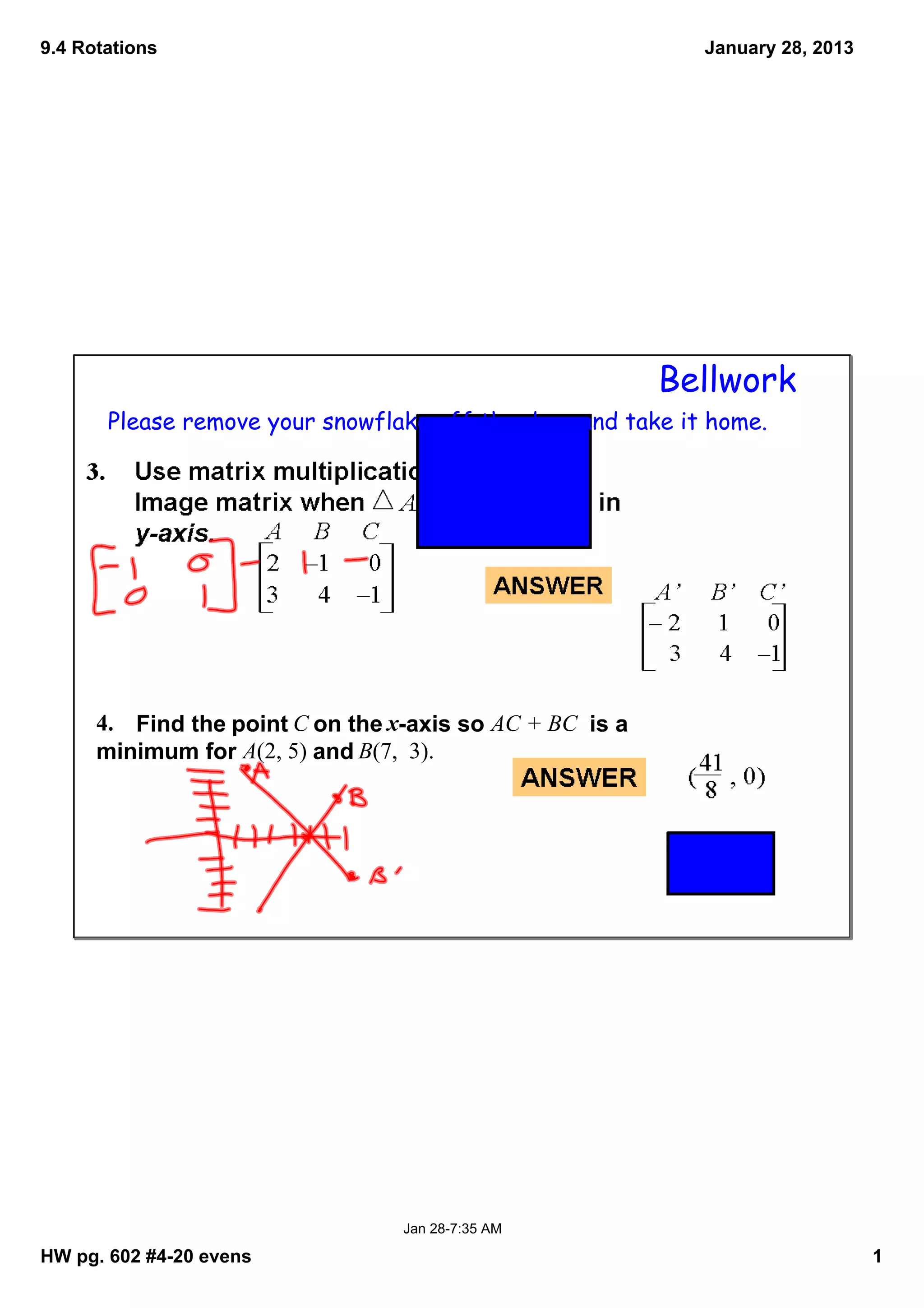This document discusses rotations in geometry. It defines a rotation as turning a figure about a fixed center point through a given angle. The rules for rotating figures about the origin by 90, 180, and 270 degrees are presented. Rotation matrices for rotating a point by 90, 180, 270, and 360 degrees are shown. Finally, the document states that a rotation is an isometry according to the Rotation Theorem.