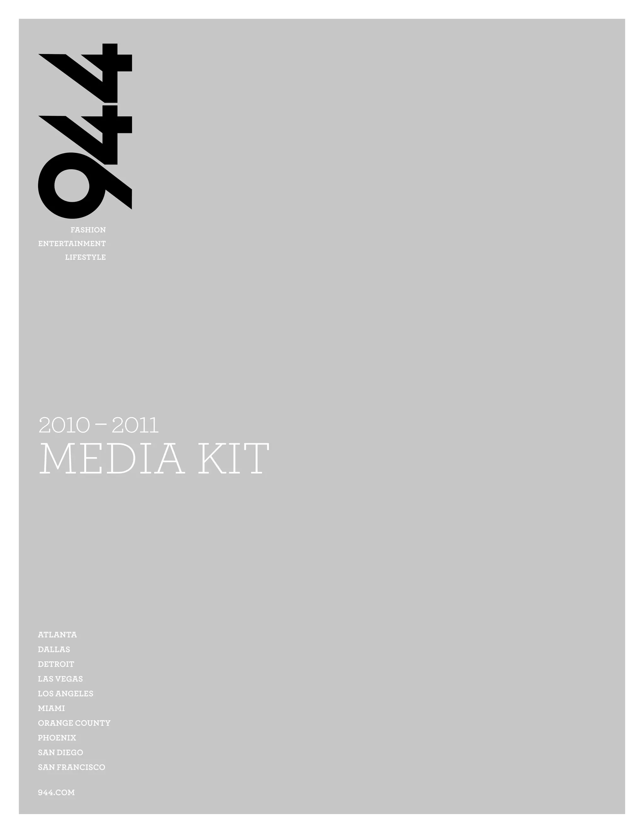 This document is a 2010-2011 media kit for 944 Magazine. It provides an overview of the magazine, including its mission, history of expansion to 10 cities, readership demographics, and editorial calendar for 2010. Key details include that 944 Magazine is a lifestyle publication focused on fashion, entertainment, and lifestyle. It reaches over 2.5 million readers annually across 10 major US cities. The media kit outlines the magazine's credentials and top reasons for advertisers to work with 944.