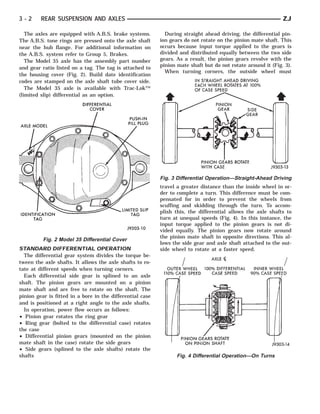 The document provides information about rear suspension and axles for a Grand Cherokee vehicle. It describes the main components of the rear suspension system, including coil springs, upper and lower suspension arms, shock absorbers, stabilizer bar, track bar, and jounce bumpers. It also explains how the standard differential allows the axle shafts to rotate at different speeds when turning corners to compensate for the longer path of the outside wheel. The Model 35 axle used in the Grand Cherokee can be equipped with an optional Trac-Lok limited slip differential.