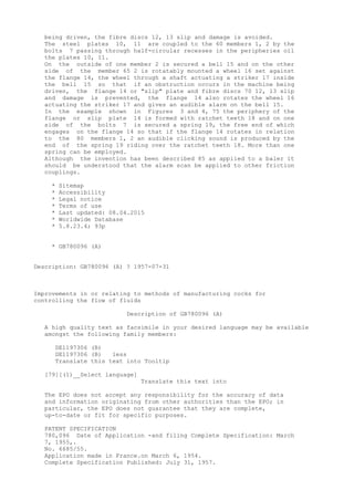 This document describes a patent for improvements in friction couplings used in baling machines and other power driven machines. Specifically, it details a friction coupling that provides an audible alarm when slipping occurs. The coupling has two plates between which are fabric-lined slip discs. When slipping causes the slip discs to rotate, it actuates an audible alarm such as a bell. Alternatively, ratchet teeth on the slip disc can click against a spring to produce an audible warning of slipping. The invention provides a way to detect and warn of slipping in a friction coupling.