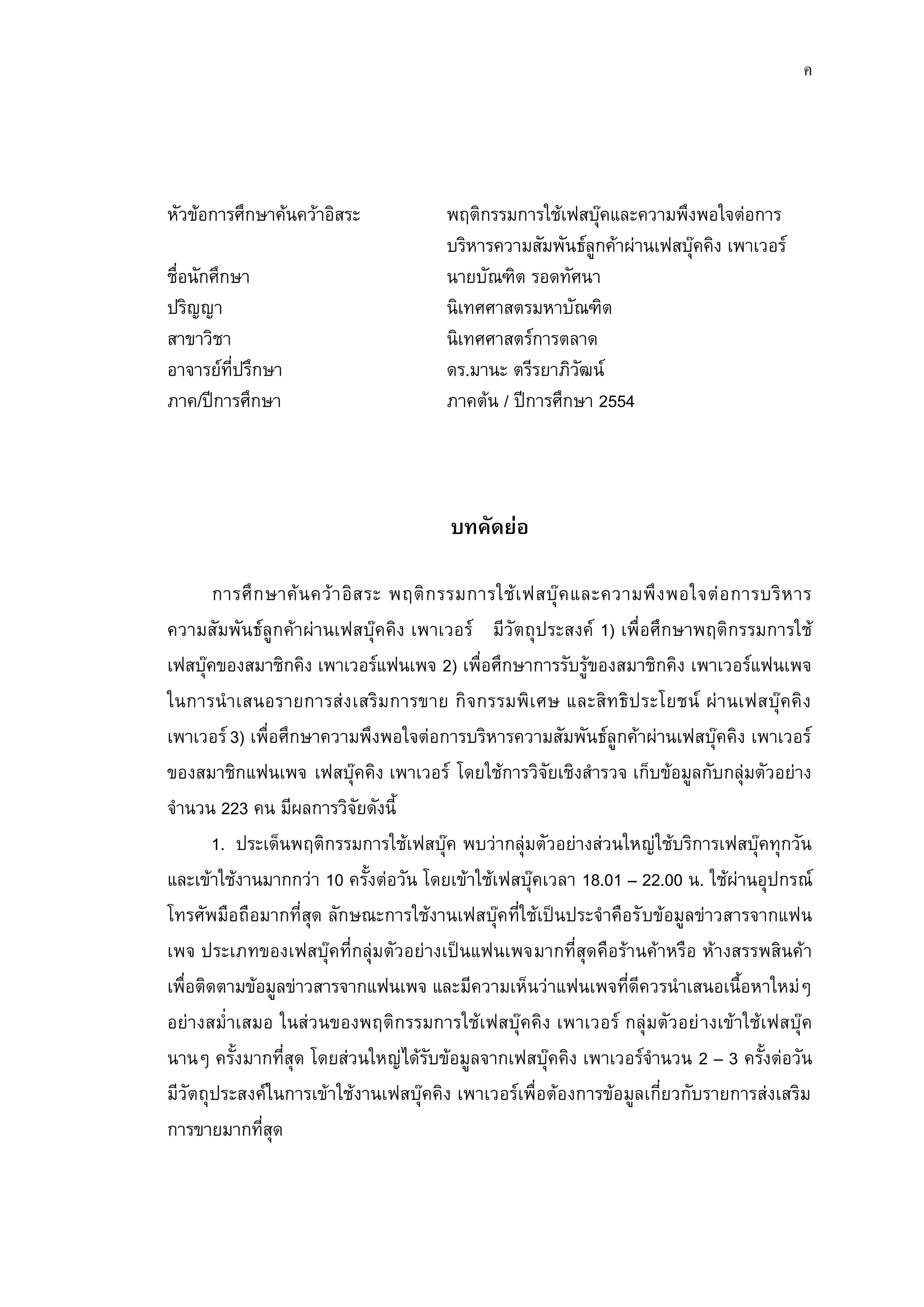 ตัวอย่างบทคัดย่อ เรื่องพฤติกรรมการใช้เฟสบุ๊คและความพึงพอใจต่อการบริหารความสัมพันธ์ลูกค้าผ่านเฟสบุ๊คคิงเพาเวอร์