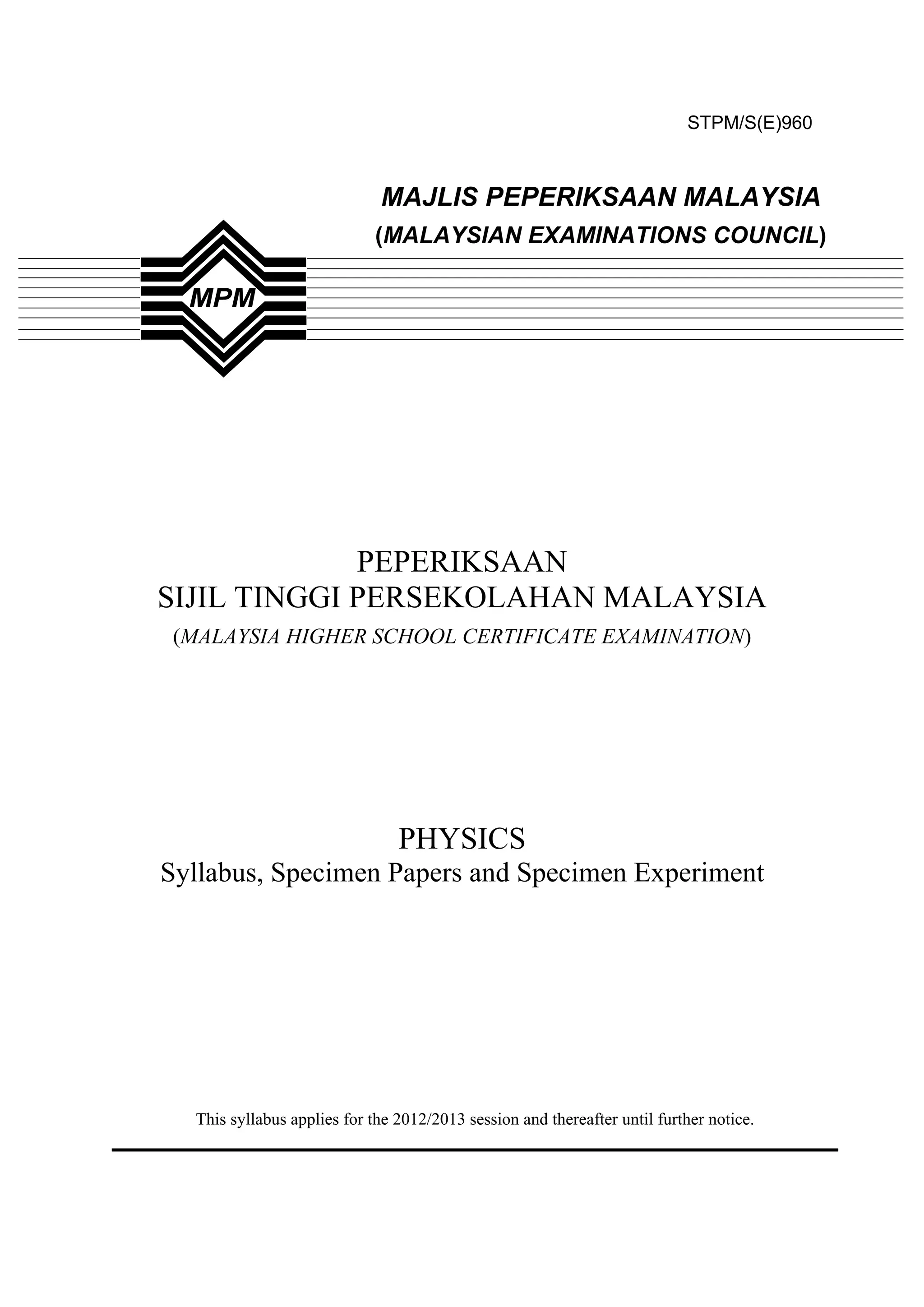 This document provides information about the STPM/S(E)960 Physics syllabus, including: