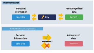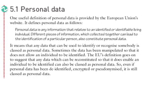 This document discusses various methods for keeping personal data secure and preventing unauthorized access. It describes de-identification and pseudonymization as strategies to prevent identity revelation from personal data. It also discusses encryption, firewalls, penetration testing, authentication techniques like passwords and biometrics, restricting access levels, software updates, and policies to control network use. Specific risks like pharming and phishing that try to steal login credentials are explained, along with recommendations to avoid them like using antivirus software and verifying website URLs.