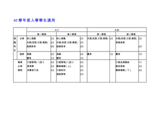此文档列出了97学年度入学学生的课程安排,包括必修和选修课程设置。需要满足的毕业学分条件为至少80学分(不含体育),并规定了一些课程的先修要求和免修政策。此外,文档中提及了不同专业领域的详细课程信息以及教学注意事项。