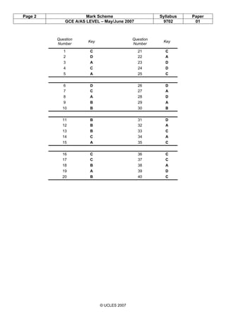 This document contains mark schemes for physics examinations from the University of Cambridge International Examinations in May/June 2007. It provides: