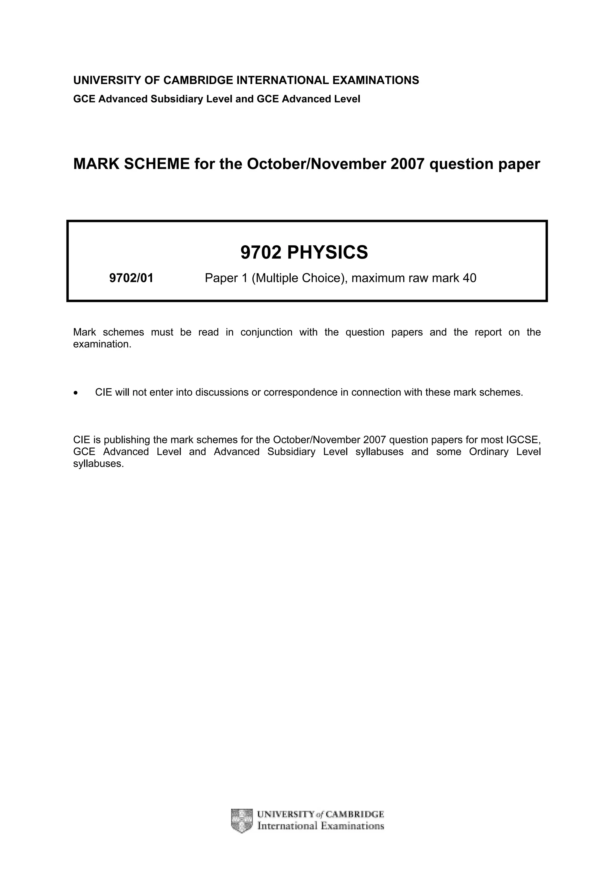 The document provides mark schemes for physics examinations administered by the University of Cambridge in October/November 2007. It includes mark schemes for multiple choice and structured questions papers, as well as an advanced practical skills paper. The mark schemes provide examiners guidance on awarding marks to student responses, including examples of expected answers and allocation of marks. CIE will not enter into discussions about the mark schemes, and are publishing them to aid teachers and students.