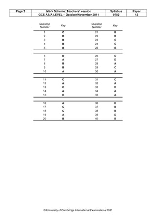 This document provides the mark scheme for the October/November 2011 GCE Advanced Level Physics exam paper 1, which contains 40 multiple choice questions. It lists the question number and key/correct answer for each question. Cambridge will not enter into discussions about these mark schemes. The mark schemes are published to provide guidance for teachers evaluating student responses on the exam.