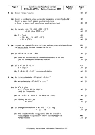 This document is a mark scheme for a physics exam that provides guidance for teachers on how to award marks to exam answers. It shows the requirements for each exam question and gives examples of answers that would receive marks. The mark scheme is intended to ensure examiners apply the marking criteria consistently and consider acceptable alternative answers. It does not reflect all the details examiners may discuss before marking begins.