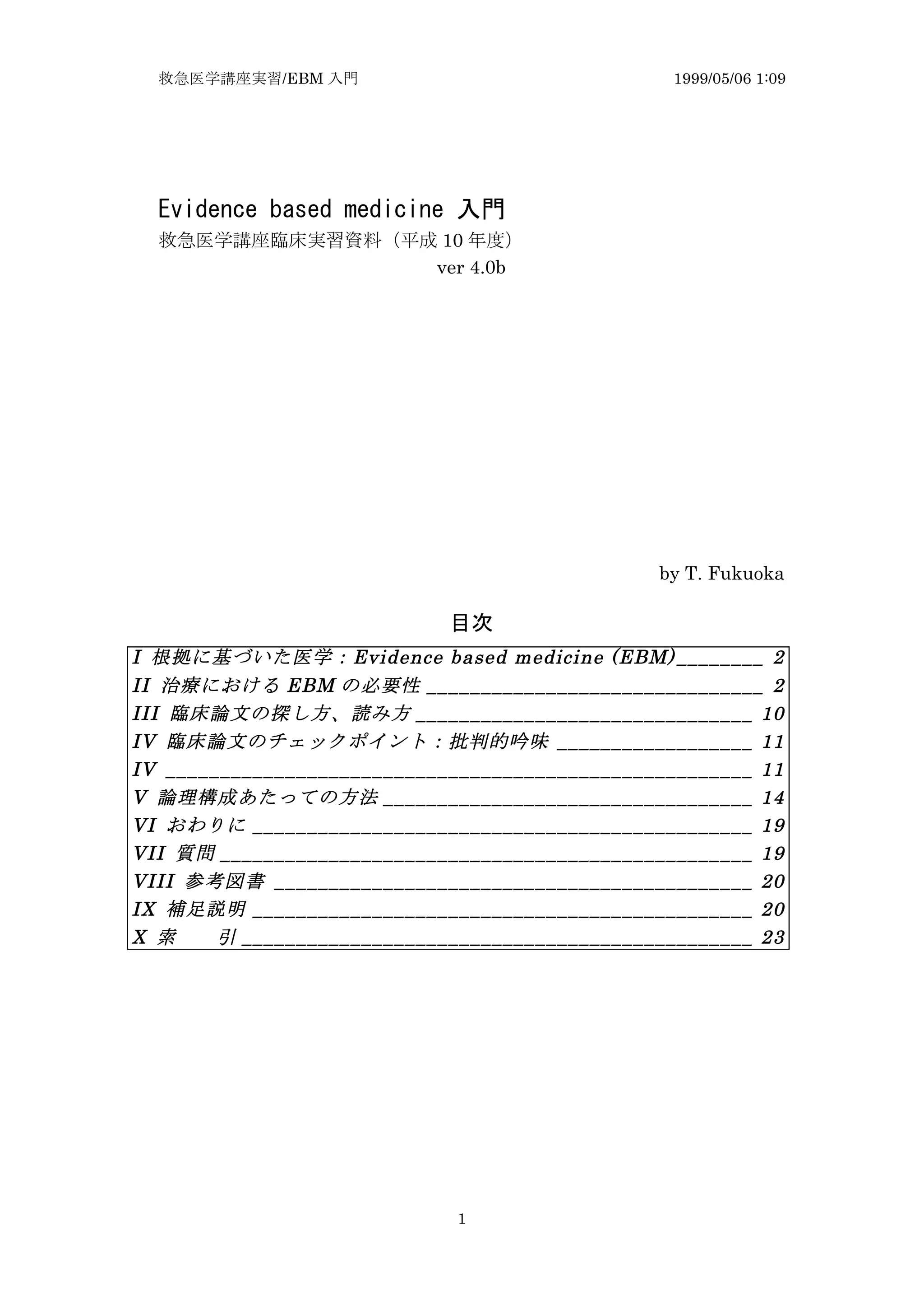 The document outlines principles of evidence-based medicine (EBM), emphasizing the importance of randomized controlled trials (RCTs) as the gold standard in clinical research. It discusses the methodologies used in EBM, including trial design and statistical analysis, while highlighting various types of studies like case reports and cohort studies. The content serves as a reference, indicating that the material is dated and may not be suitable for current educational use.