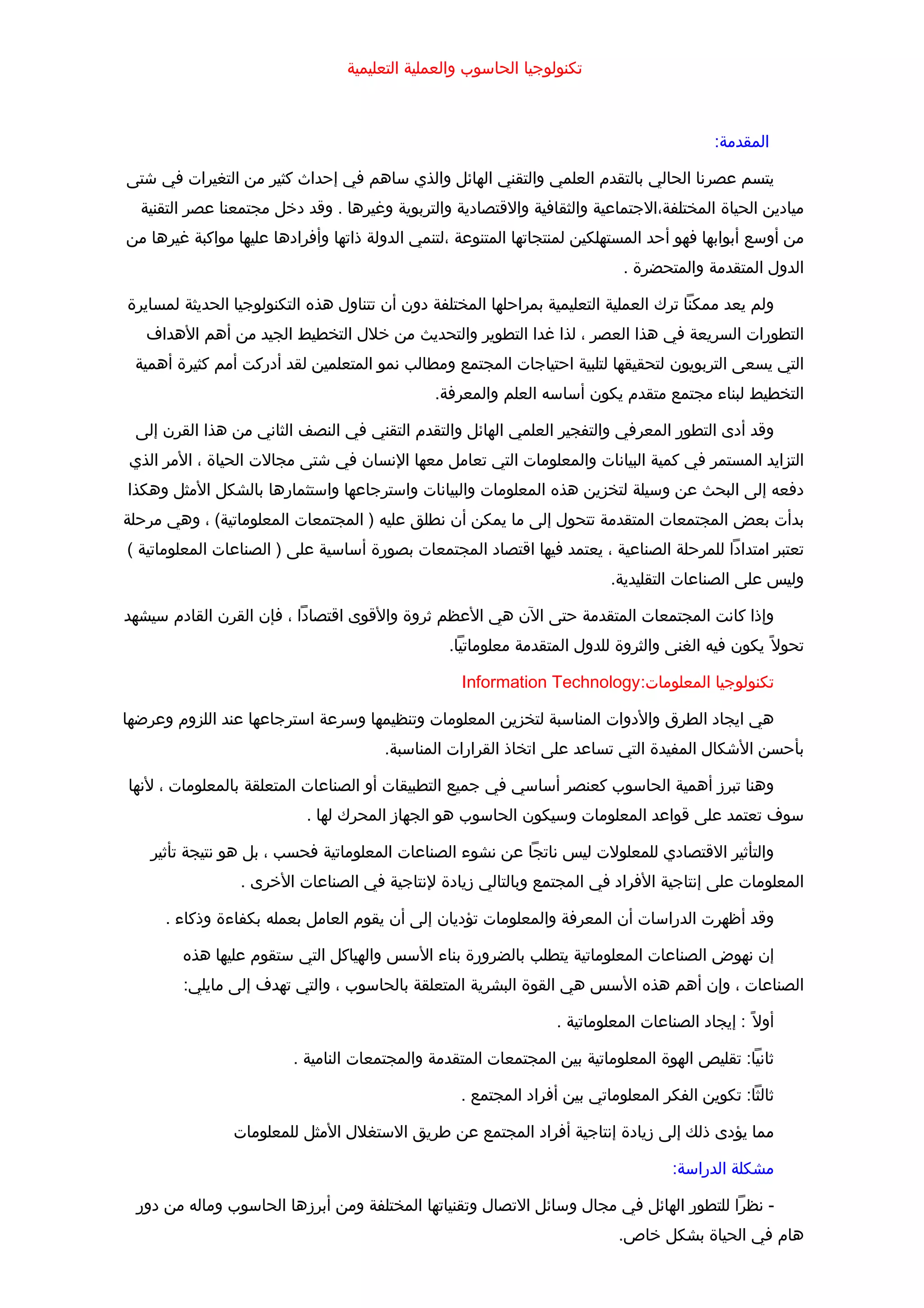 تتناول الوثيقة تأثير تكنولوجيا الحاسوب على العملية التعليمية، مشيرة إلى ضرورة إدماج التكنولوجيا في التعليم لمواكبة التطورات السريعة. كما تسلط الضوء على مزايا استخدام الحاسوب والإنترنت في تعزيز جودة التعليم وتحقيق الفعالية التعليمية. تهدف الدراسة إلى استكشاف دور تكنولوجيا المعلومات في التعليم وتقديم توصيات لتحسين استخدام هذه التقنية.