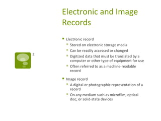 This document discusses different types of electronic and image records used for data storage. It describes various storage media such as magnetic media like hard drives, optical media like CDs and DVDs, and solid-state media like flash drives. It also covers procedures for inputting, retrieving, and maintaining electronic records, as well as ensuring their safety and security. The document concludes by discussing image records stored using micrographics and associated production and storage processes.
