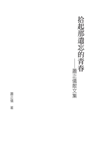 《拾起那遗忘的青春》是蕭正儀的散文集,通过细腻的描绘与个人情感,展现了对过去的怀念与反思。书中回忆起青春的岁月,用语言传达对家庭、爱情及生命的深入思考。蕭正儀希望通过这本书,能够唤起读者的共鸣与感悟,让心灵的交流更加流畅。