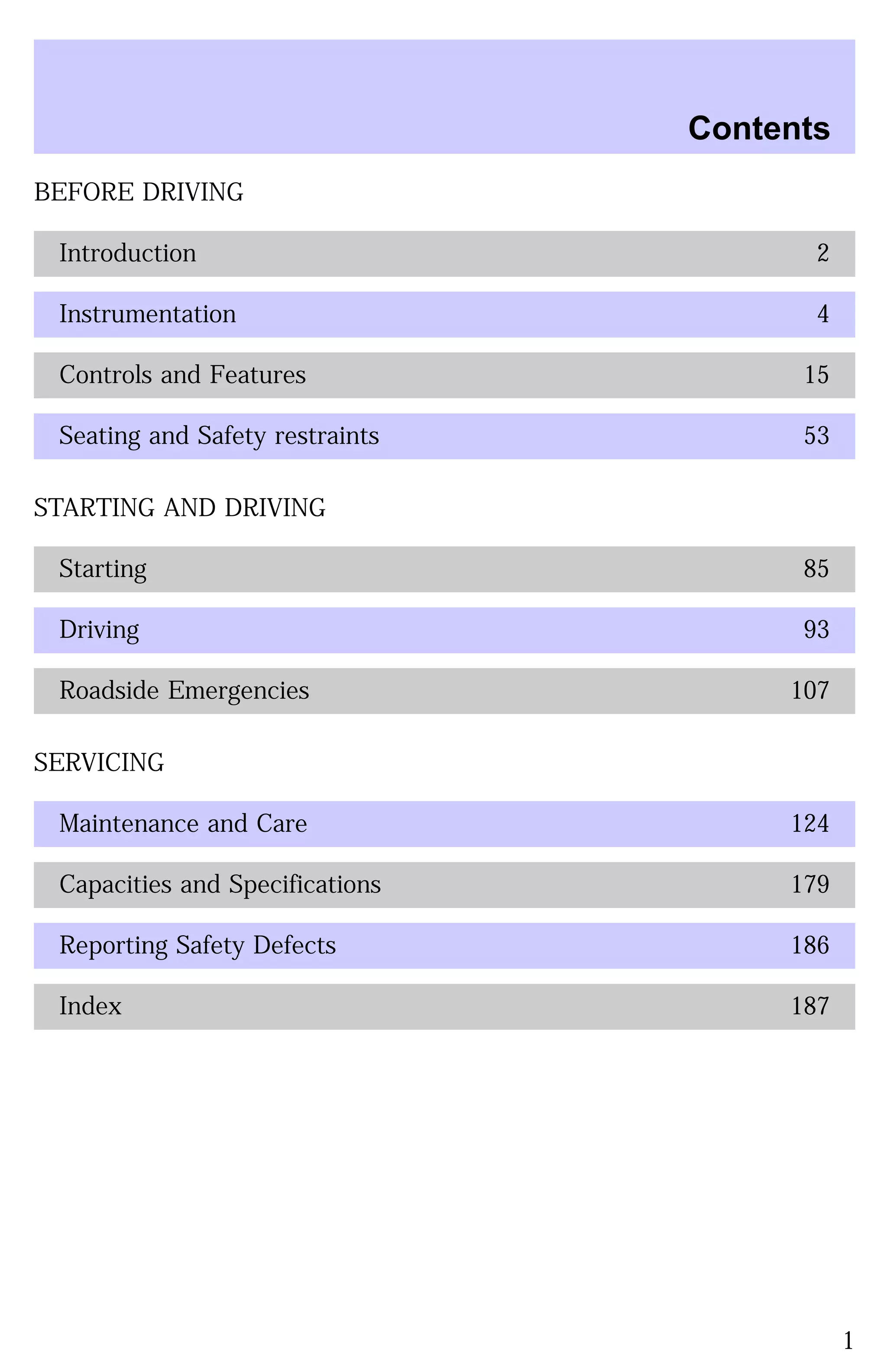 The document provides information about instrumentation, controls, and features for a vehicle. It includes descriptions and illustrations of the instrument cluster, warning lights, gauges, switches, mirrors, climate controls, audio system, and other interior components. Instructions are provided for starting the vehicle, driving, parking brake operation, and safety belt usage. Maintenance and repair information is also included.