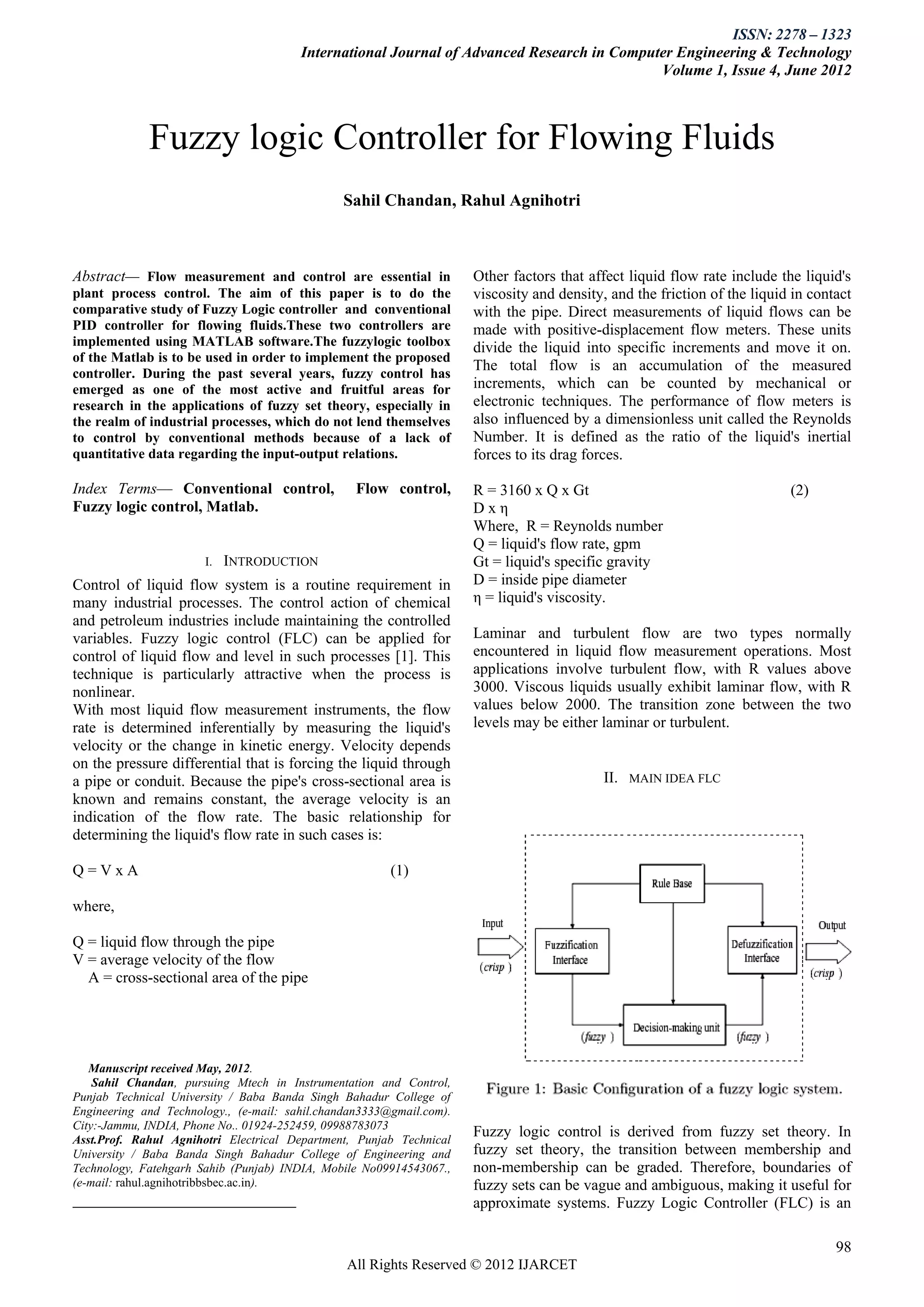 This document discusses fuzzy logic control for liquid flow systems. It begins by introducing the basics of liquid flow measurement and control, noting that factors like viscosity, density, and pipe friction affect flow rate. It then discusses the main components of a fuzzy logic controller, including fuzzification, a rule base and inference engine, and defuzzification. The document formulates the problem of measuring and controlling liquid flow rates given various disturbances. It proposes using a fuzzy logic controller instead of a conventional PID controller due to the former's robustness with imprecise models. Finally, it mentions that MATLAB will be used to implement and test the fuzzy logic controller.