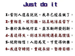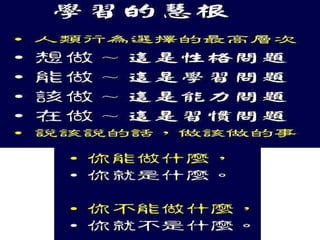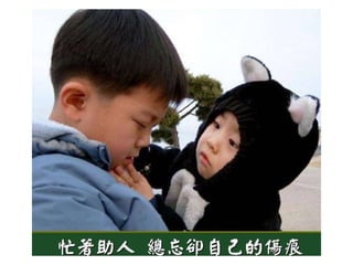但沒有人想改變自己 • 加入志工,發揮人生的價值和生命的意義 • 認識自己 、肯定自己,肯定人生的價值 • 找出生命的亮點 • 向前看, 忘掉過去 • 彌補生命的盲點 • 放下身段 ,重新學習 ,充實生命力