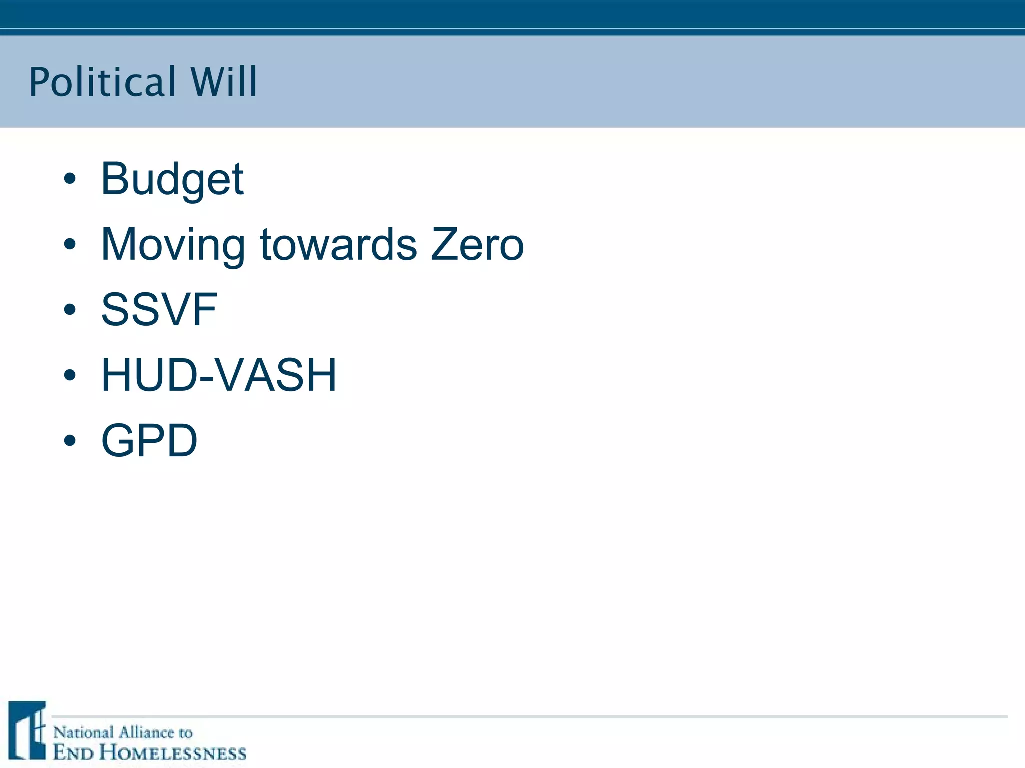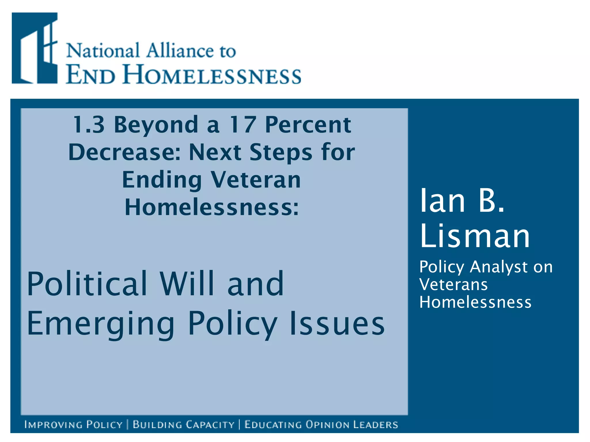 This document summarizes key points about continuing efforts to end veteran homelessness in the United States. It discusses maintaining political will through continued budget increases. The proposed FY2014 budget represents a 3.5% increase to further programs like SSVF and HUD-VASH that provide housing and services. It also outlines emerging issues like adapting GPD programs and preventing future homelessness through SSVF and other prevention services. The goal is to establish robust systems to ensure functional zero veteran homelessness nationwide.