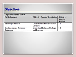 The document discusses database security and administration. It covers topics like database security concepts including permissions, logins, and accounts. It also discusses server-level security, database-level security, object permissions, and authentication. Additionally, it summarizes database server roles, backups, restores, and other administrative tasks.