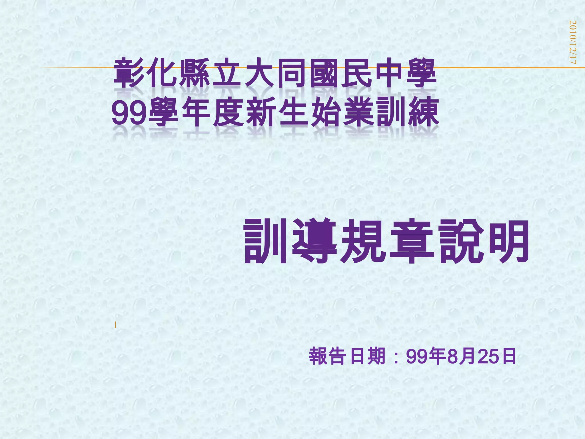 文档介绍了彰化县立大同国民中学99学年度新生始业训练的相关信息,包括训导规章、服务团队及联系方式。重点强调建立学生自我管理和秩序的学习态度,创造安全和健康的学习环境。提供了各组工作的具体责任和反霸凌申诉渠道。