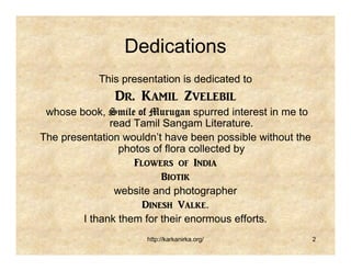 The document is a detailed listing of 99 Tamil flowers, including their common names, botanical names, and some context about their significance in Tamil literature and culture. It also contains acknowledgments to contributors for their photographic work and the exploration of flowers in Tamil culture. The list includes various flowers with specific identities, some of which are debated or have uncertain classifications.