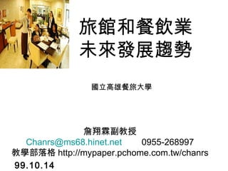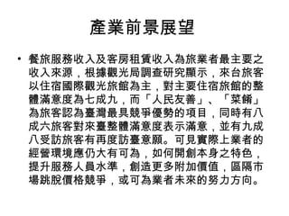 本文件探讨了旅馆和餐饮业的未来发展趋势,指出来台旅客以住宿国际观光旅馆为主,整体满意度达到79%。文件强调提升服务水平和创造附加价值是业者未来发展的关键方向。随着大陆游客的增加,国内旅游和餐饮业也显示出复苏的迹象,整体市场展现出良好的发展潜力。