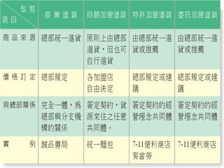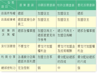 文档阐述了连锁加盟的经营与规划,包括连锁体系的优势、劣势以及不同加盟类型的定义。它还探讨了总部与加盟者之间的关系,以及如何在国际市场上成功拓展连锁业务。通过案例分析,强调了信任与支持在加盟体系成功中的重要性。