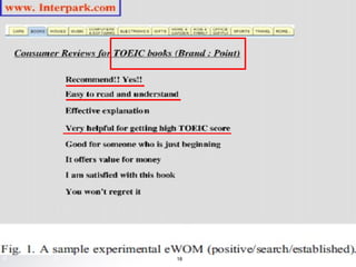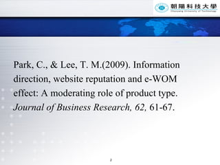 This study examined the impact of electronic word-of-mouth (eWOM) information direction and website reputation on eWOM effects, and whether these impacts vary by product type. It found that negative eWOM has a greater effect than positive, and established websites have a greater effect than unestablished ones. The eWOM effect was also greater for experience goods than search goods. It also found the impact of negative vs. positive eWOM, and established vs. unestablished websites, was greater for experience goods than search goods. The study used a 2x2x2 between-subjects design and analyzed the results with ANCOVA.