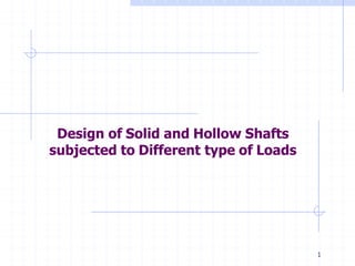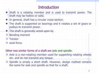 This document discusses the design of solid and hollow shafts subjected to different types of loads. It covers standard shaft sizes and materials, design considerations based on strength and stiffness, stresses due to bending, axial force and torsion, and design according to the ASME code. Example problems are also included to calculate shaft diameters based on strength using factors like load, material properties, and safety factors.