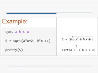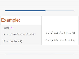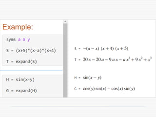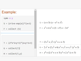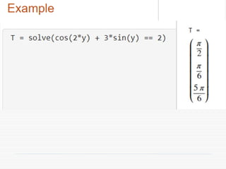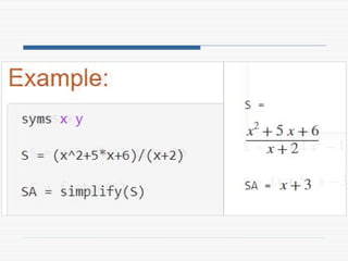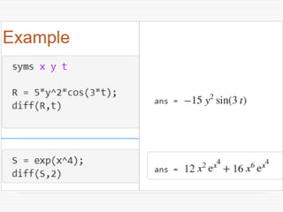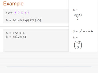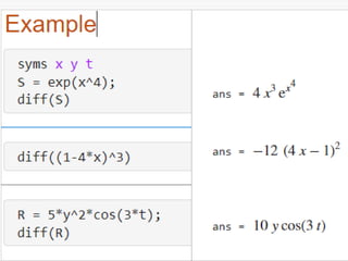 The document provides a comprehensive introduction to symbolic mathematics, detailing how to create symbolic objects, perform algebraic operations, and solve equations using MATLAB. It covers essential commands such as 'sym', 'syms', 'solve', 'diff', and 'int' for differentiation and integration, as well as methods for manipulating and plotting symbolic expressions. Additionally, it discusses solving ordinary differential equations (ODEs) symbolically and finding both general and particular solutions based on specified conditions.