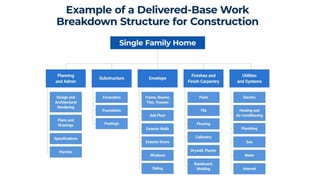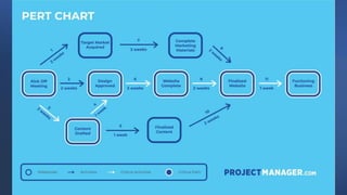 The document discusses project management tools including the work breakdown structure (WBS), Gantt chart, program evaluation and review technique (PERT), and critical path method (CPM). It explains that a WBS breaks a project into deliverables and work packages in a hierarchical structure. A Gantt chart displays project activities and timelines. PERT and CPM are used to schedule tasks, identify dependencies, and determine the critical path. PERT uses an activity-on-arrow diagram while CPM uses an activity-on-node diagram. The document provides details on how to create each of these project management tools.