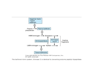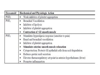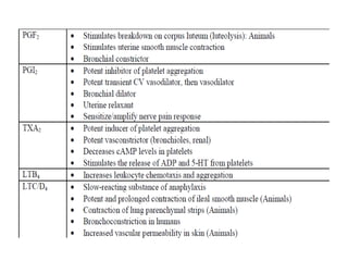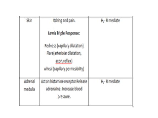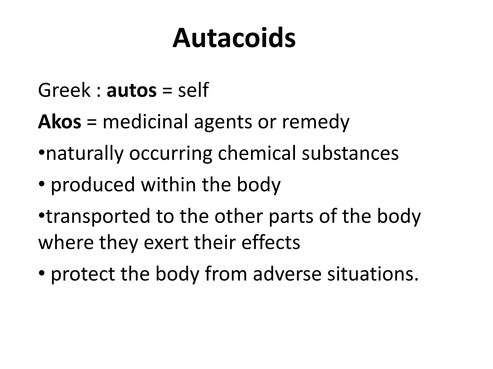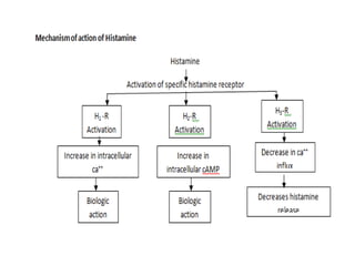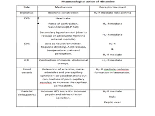 This document discusses autacoids, which are naturally occurring chemical substances produced within the body and transported to other parts where they exert effects. Autacoids include decarboxylated amino acids like histamine and serotonin, polypeptides like angiotensin and vasopressin, and eicosanoids like prostaglandins. Histamine is an important inflammatory mediator derived from histidine. It is released from mast cells and basophils and acts through H1, H2, and H3 receptors. Serotonin is a neurotransmitter synthesized from tryptophan that acts through multiple receptor subtypes and is involved in various physiological processes like sleep, mood, and gastrointestinal motility.