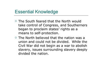 The document summarizes the differing viewpoints between the North and South that contributed to the start of the Civil War. The South feared northern control of Congress and asserted states' rights, while the North viewed the nation as an indivisible union. Slavery deeply divided the nation, though the war did not begin over it. Several compromises attempted to resolve tensions over the powers of federal and state governments and the status of slavery, but failed to prevent southern secession after Lincoln's election.