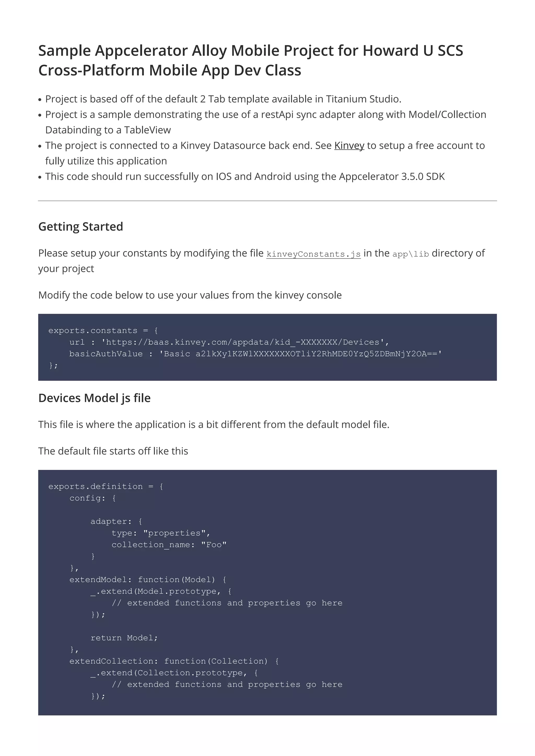 This document details a sample Appcelerator Alloy mobile project for a class at Howard University, demonstrating cross-platform app development using a REST API sync adapter and model/collection databinding. It provides instructions for setting up the project with Kinvey as the backend and explains modifications to the default model for integrating the REST API, including the configuration of authorization headers. Key code implementations and best practices for utilizing the Alloy framework are discussed throughout the document.