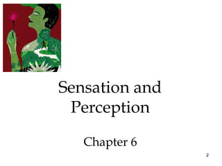 This document discusses chapters from a psychology textbook on sensation and perception. It covers topics like the basic principles of sensation including thresholds and sensory adaptation. It describes the senses of vision, hearing, touch, taste, smell, and kinesthesia. It discusses perceptual organization including principles of form, depth, motion and constancy. It examines perceptual interpretation and how experience shapes perception. It analyzes studies on sensory deprivation and adaptation. In 3 sentences or less, it provides an overview of the key topics and concepts covered in the textbook chapters on sensation and perception.