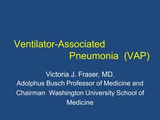 This document discusses ventilator-associated pneumonia (VAP). It begins with the epidemiology of VAP, including that it is the second most common ICU infection and responsible for half of all ICU antibiotics. Risk factors for VAP include increased duration of mechanical ventilation and prior antibiotic use. Diagnosing VAP is challenging due to the lack of a definitive test. Methods for prevention include keeping the head of the bed elevated, daily sedation vacations, and the use of bundled interventions. Quantitative cultures and invasive diagnostic tests provide more specific diagnosis but do not consistently alter management or improve outcomes.