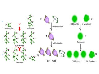 2. Mendel conducted experiments on pea plants and determined rules for inheritance through traits being dominant or recessive. He found traits were inherited in predictable ratios.