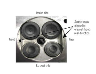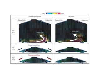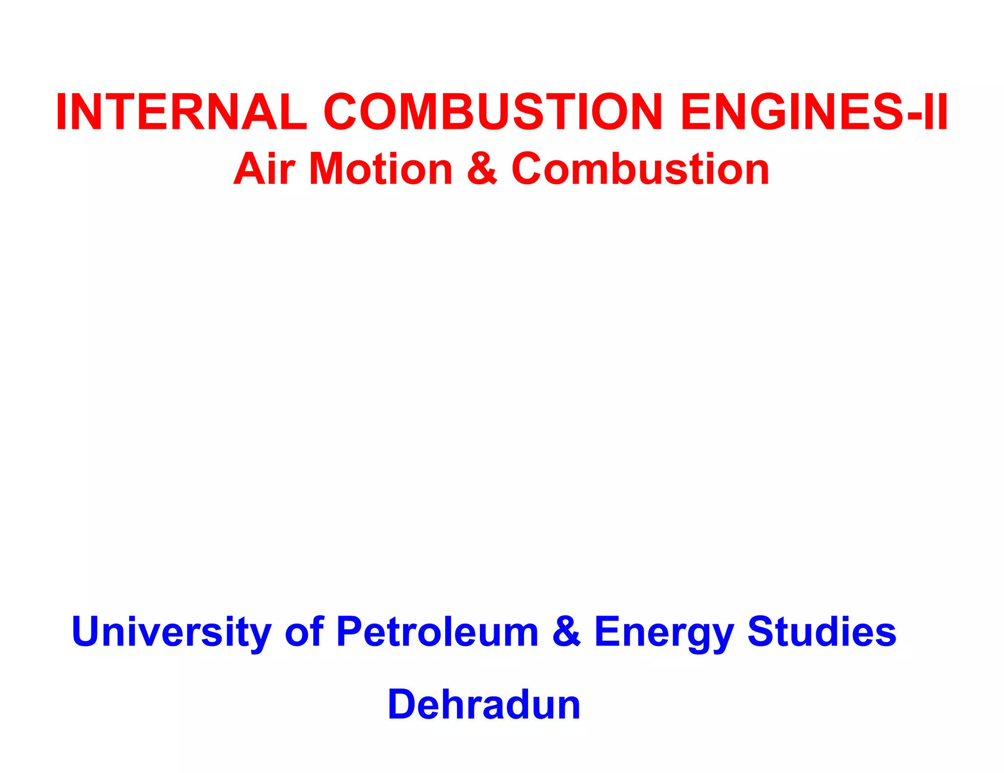 This document discusses air motion and combustion in internal combustion engines. It describes how swirl, tumble, and squish generate motion within the cylinder to promote fuel-air mixing and combustion. Swirl involves rotation around the valve axis, while tumble is perpendicular to the cylinder axis. Squish occurs as the piston approaches top dead center and compresses the mixture towards the combustion chamber. The document also mentions crevice flows and blowby, which involve gas escaping into engine crevices and crankcase. Finally, it describes how fuel is injected into the compressed air in CI engines to initiate combustion through fuel-air mixing.
