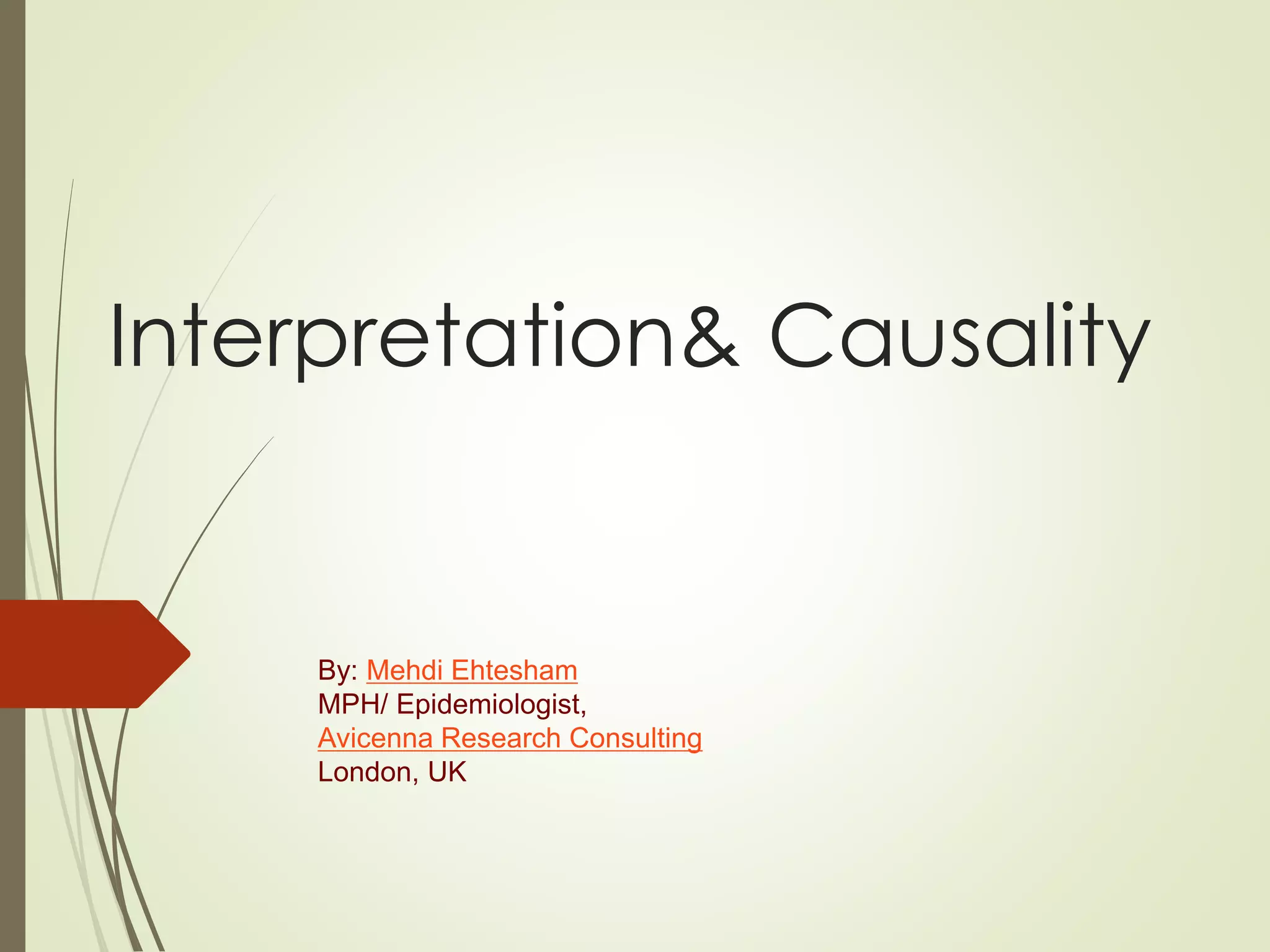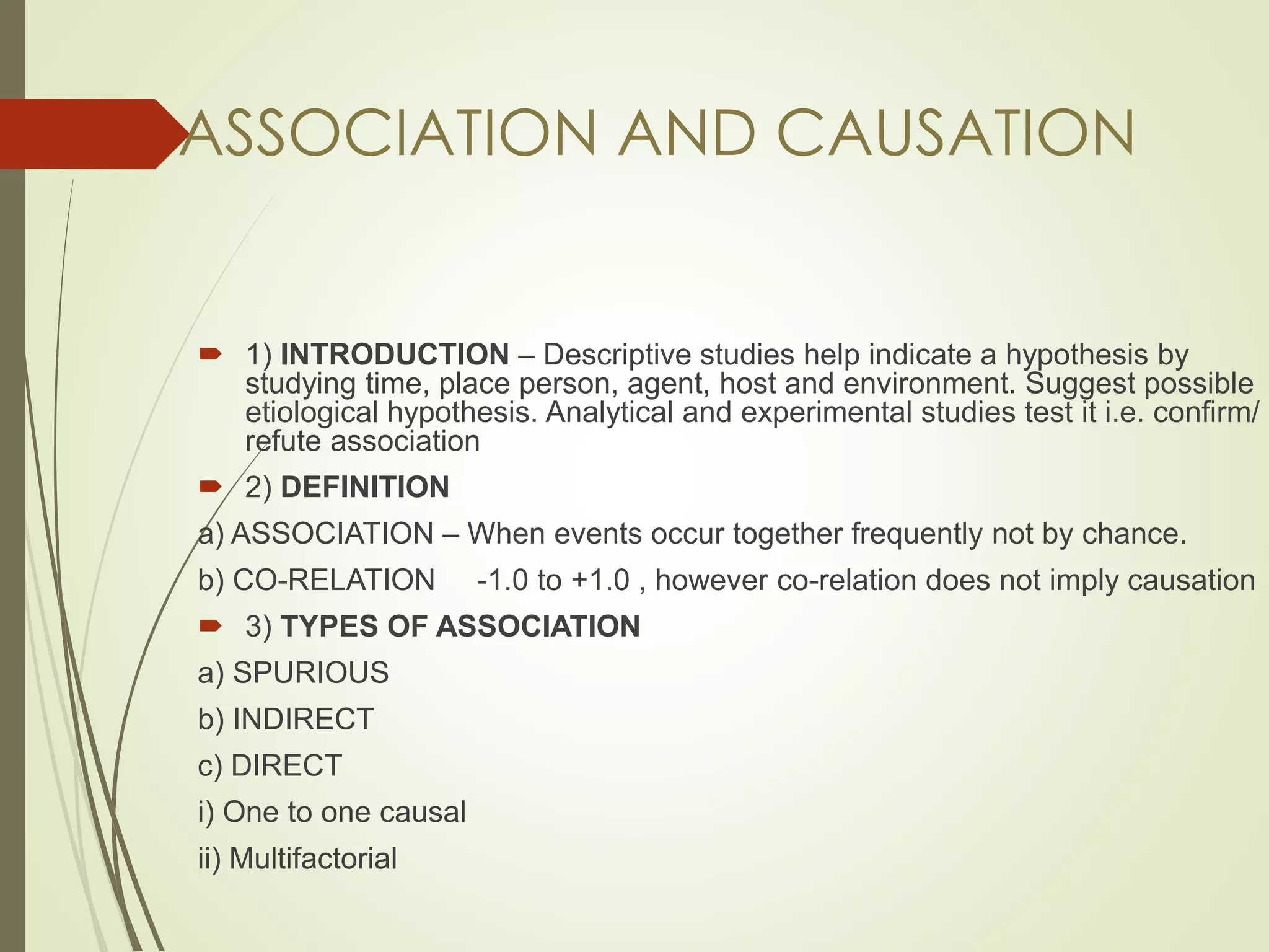 This document discusses the concepts of association versus causation in epidemiology. It defines association as events occurring together more frequently than expected by chance, while causation requires proving a direct causal relationship. The document outlines different types of associations and discusses how associations can be due to chance, bias, confounding or true causation. It also discusses various criteria for establishing causality such as strength of association, consistency of findings, temporal relationship, dose-response relationship, and consideration of alternative explanations.