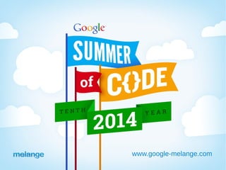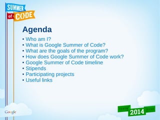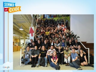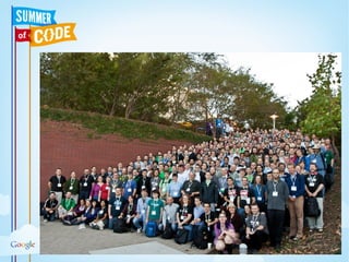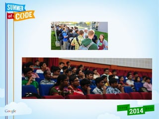 This document provides information about Google Summer of Code and Google Code-in programs. It summarizes that Google Summer of Code is a program that provides stipends for university students to work on open source software projects over the summer. It outlines the goals of exposing students to real-world development, getting more open source code created, and helping projects bring in new developers. Google Code-in is a contest for younger students to earn certificates for introductory tasks related to open source projects.
