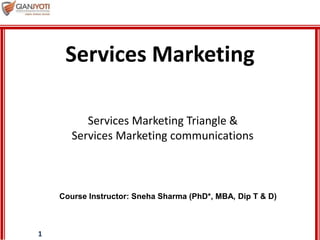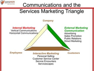 The document discusses integrated marketing communications for services. It provides examples of FedEx's "Relax, It's FedEx" integrated marketing campaign from 2004-2008. The campaign used consistent messaging across television, print, radio, and websites to demonstrate FedEx's reliable services. It also encouraged word-of-mouth promotion and indirectly featured satisfied customers. For the campaign to be effective, FedEx evaluated metrics like brand awareness, website traffic, sales growth, and ensured internal communications across customer touchpoints were aligned.
