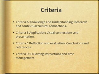This document outlines the criteria and instructions for an assignment involving analyzing two artists from a cultural and visual perspective. It will be presented in the format of a Pechakucha, which is a 20 slide, 20 second per slide presentation. Criteria includes demonstrating knowledge of the artists' cultural and historical contexts, making visual connections between their works, providing conclusions, and following instructions. Key concepts are defined for culture, context, and the Pechakucha format. A list of artists is provided from which two must be chosen, without being from the same context. An exercise is described where cultural and visual connections between the two artists must be established. Resources, a word count for conclusions, presentation date, and deadline for
