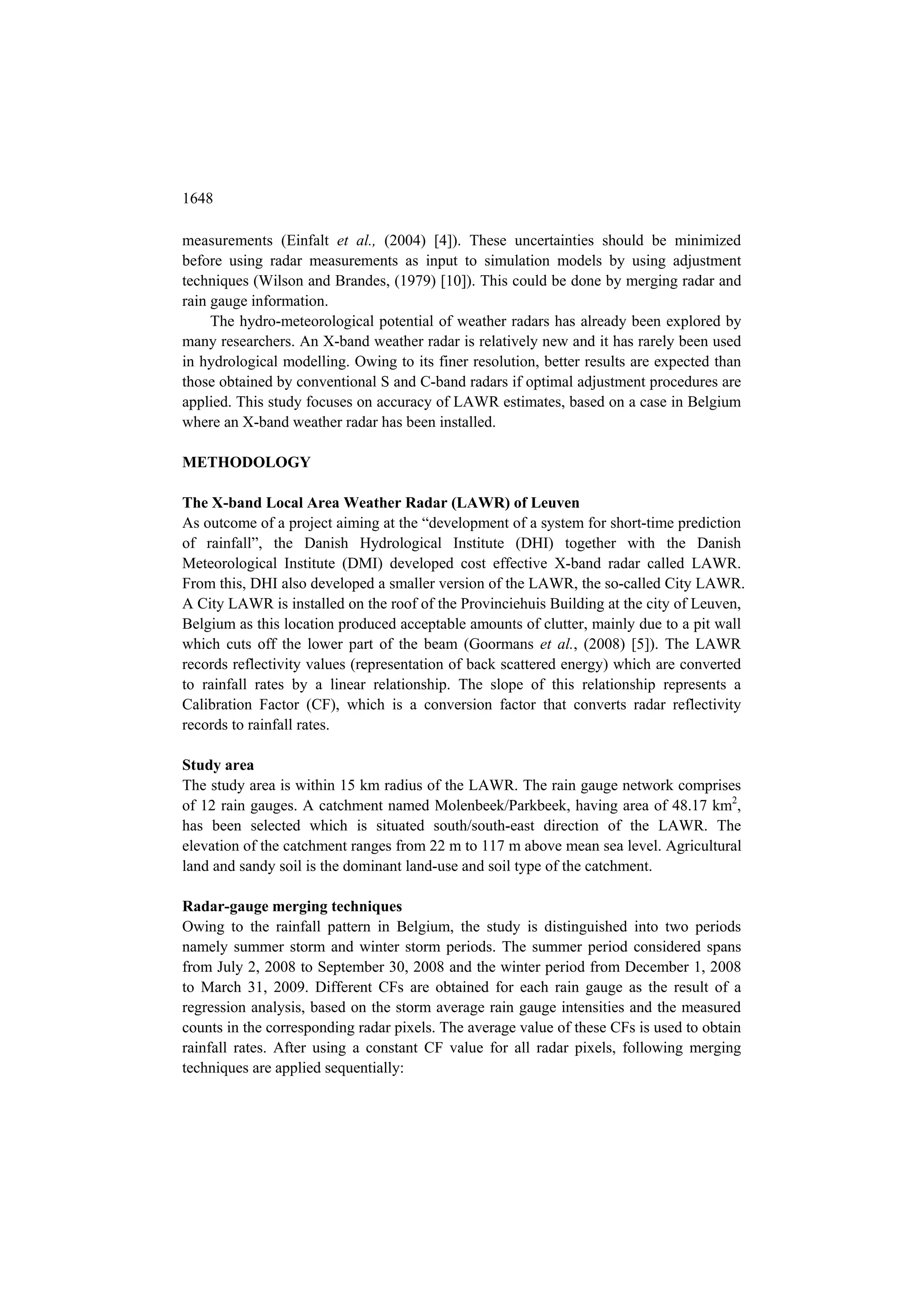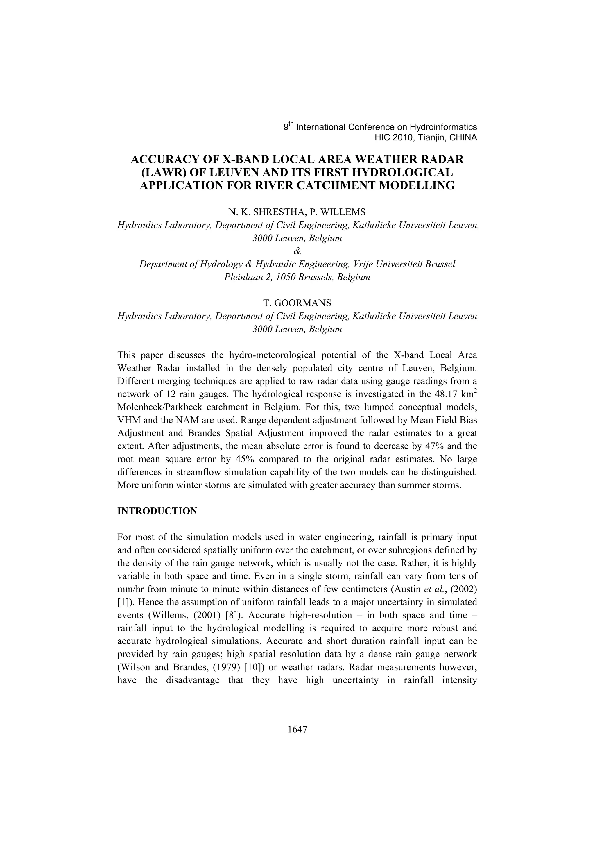 This document summarizes the accuracy of rainfall estimates from an X-band Local Area Weather Radar (LAWR) installed in Leuven, Belgium and its application for hydrological modelling of the 48.17 km2 Molenbeek/Parkbeek catchment. Different adjustment techniques including range dependent adjustment, mean field bias adjustment, and Brandes spatial adjustment were applied to raw radar data, improving the mean absolute error by 47% and root mean square error by 45% compared to original radar estimates. Two rainfall-runoff models, VHM and NAM, were used to simulate streamflow in the catchment, showing similar performance and greater accuracy simulating more uniform winter storms than summer storms.