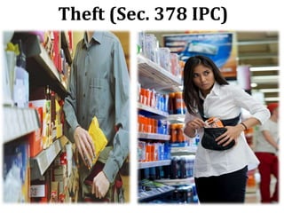 The document defines theft under Section 378 of the Indian Penal Code. The key points are: