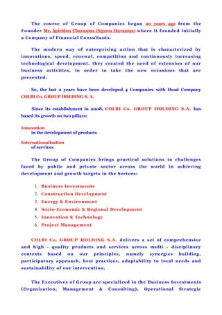 COLBI Co. GROUP HOLDING S.A. is a group of companies that provides consulting services for business investments, property management, construction projects, and more. It operates across various sectors including energy, environment, agriculture, trade, and tourism. The group aims to successfully generate business for its clients through innovation, internationalization, and sustainable and high-quality solutions. It has been in operation for over 20 years and provides strategic consulting, management services, and implements complex projects.